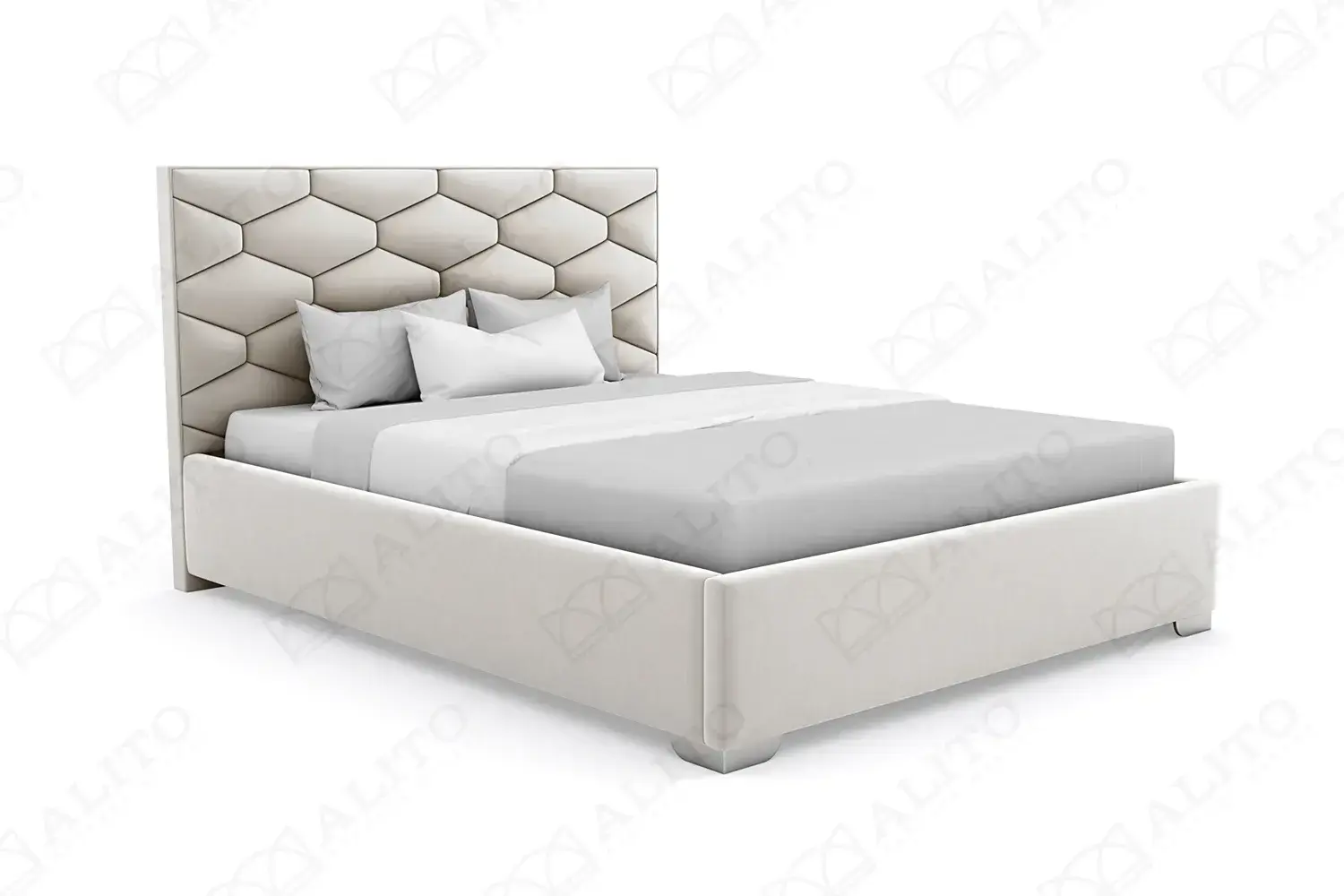 Современная кровать Коралл от Alito с оригинальным мягким изголовьем, представленным в виде геометрически выпуклого рисунка, которое некоторые называют пчелиными сотами.